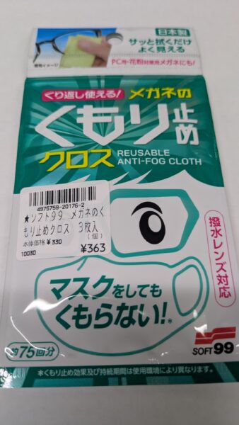 ★メガネのくもり止めクロス・・・さっとふくだけよく見える!が、キャッチコピーの優れもの。冬はマスクも使ってくもりがちですが、このクロスでふくとくもりにくくなるそうです。繰り返し使えて、3枚入りで税込み363円とお得価格です。撥水レンズ対応です。