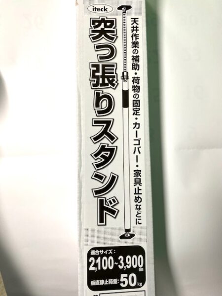 ★メーカー/アイテックの突っ張りスタンド・・・突っ張り棒タイプで、小さいものはすぐの転倒防止やカーテンの簡易的なとりつけなどにも使用されますが、垂直静止荷重は50㎏です。家での使用の他、車の中の仕切りに使ったり、2本使用すれば板を載せて仕切りや棚などにも変身します。BBQやお庭での会食時にはシートを挟んで簡単な屋根や壁ができるので、ちょっとしたスペースづくりにも役立ちます。お値段は税込み6380円。2.1mから3.9mまで伸縮可能です。