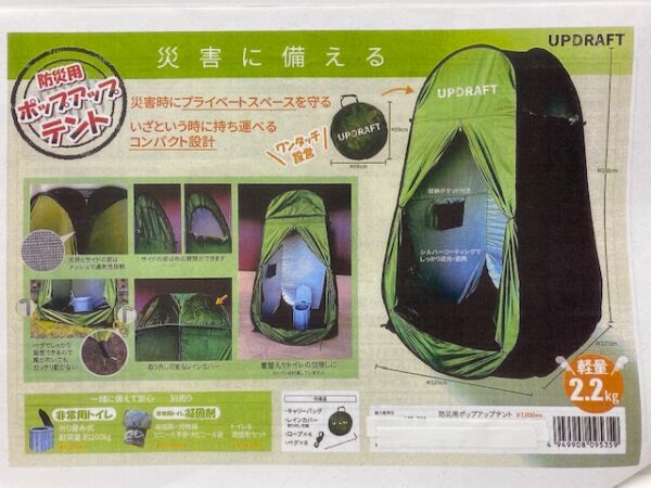 ★メーカー/アップドラフトの防災用ポップアップテント・・・災害時に備えるテント。プライベートスペースを守ります。いざというときに持ち運べるコンパクト設計でワンタッチで設営完了です。2.2㎏という軽量ながら、その活躍は様々なシーンであります。災害時のトイレには、折りたたみトイレと合わせて使うと個室のトイレとなります。それ以外には、夏のレジャーの海ややまでの着替えスペースなどでも大活躍ですね。お値段は4730円。シルバーコーティングで遮光遮熱です。